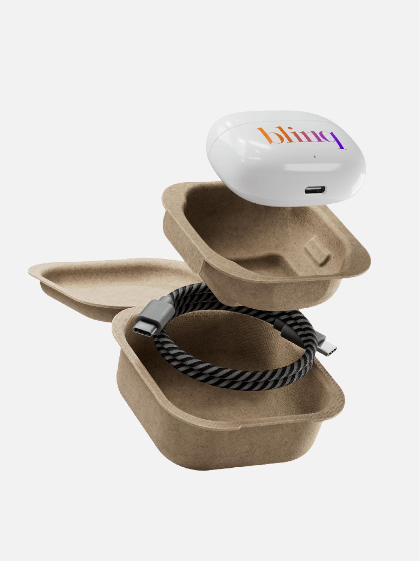 Vyrobeno z FSC certifikovaného lisovaného papíru (70 % kraft, 30 % bambusové vlákno) a navrženo tak, aby šetřilo prostor při přepravě.