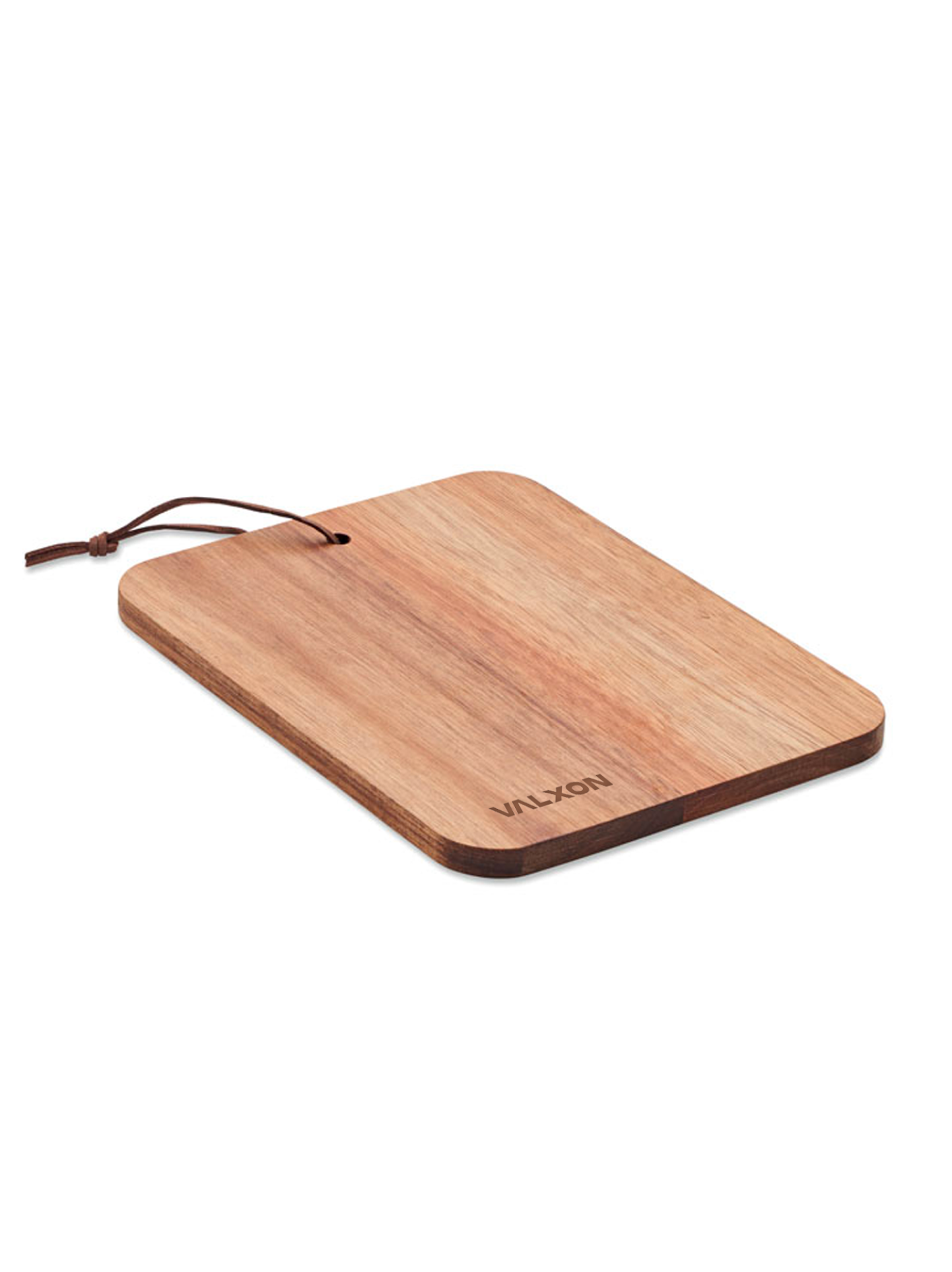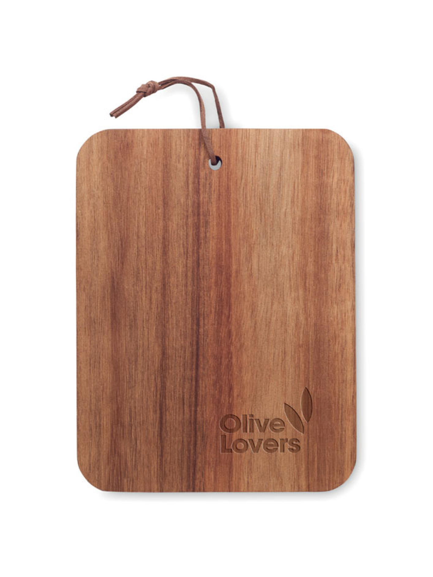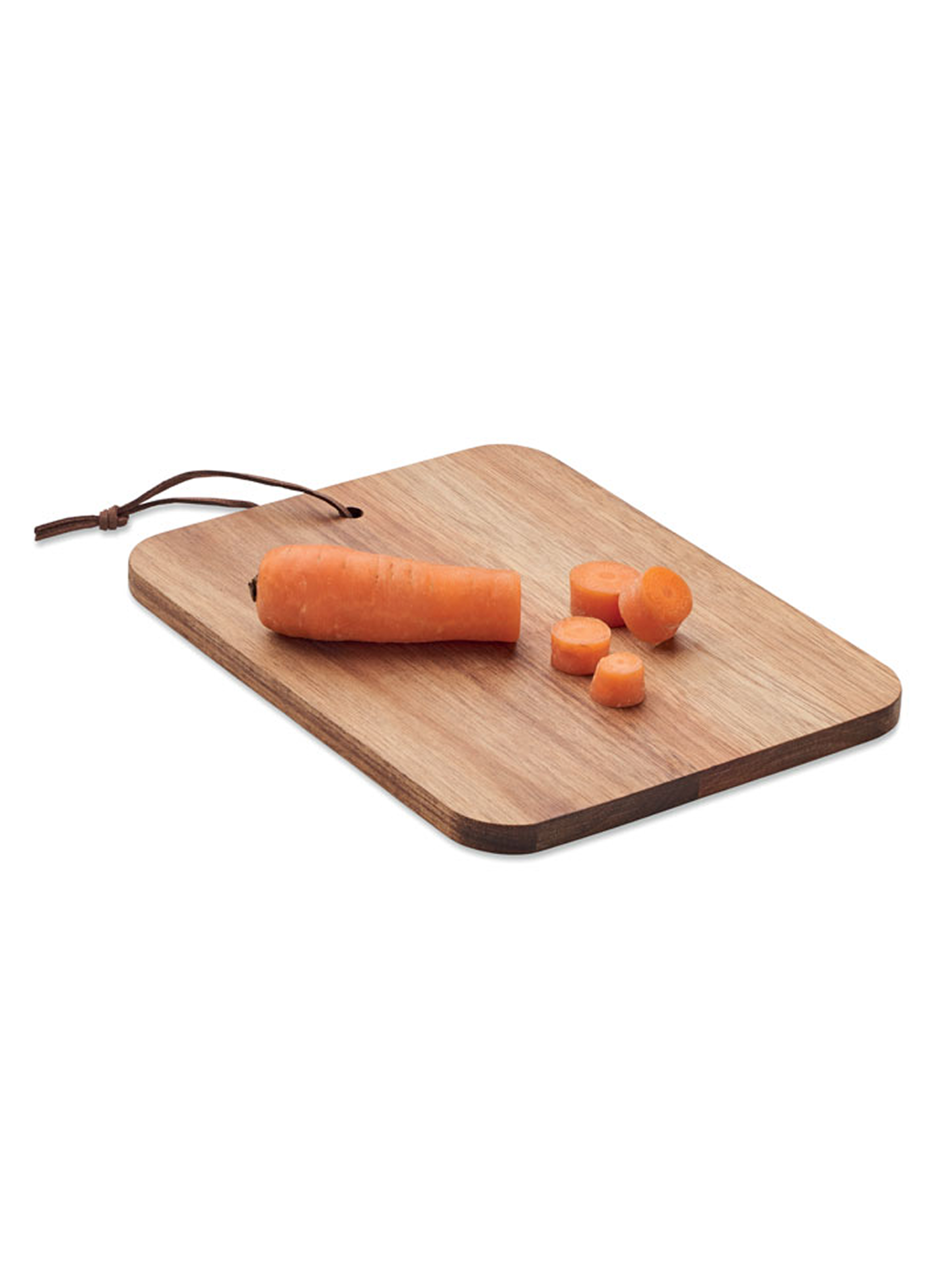 Kompaktní krájecí prkénko z akáciového dřeva s praktickou PU šňůrkou pro zavěšení. Přírodní materiál zaručuje jedinečný vzhled každého kusu a je vhodný pro laserové gravírování loga nebo jiného designu.