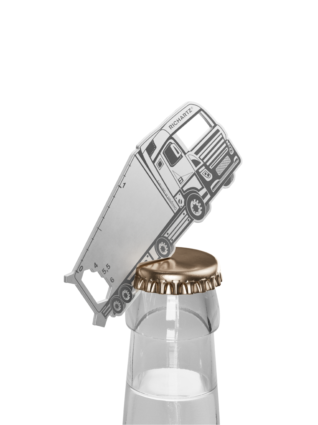 Praktický pomocník ve tvaru kamionu, který nabízí 6 užitečných funkcí pro každý den. Originální a odolný doplněk z nerezové oceli, který skvěle reprezentuje vaši značku.