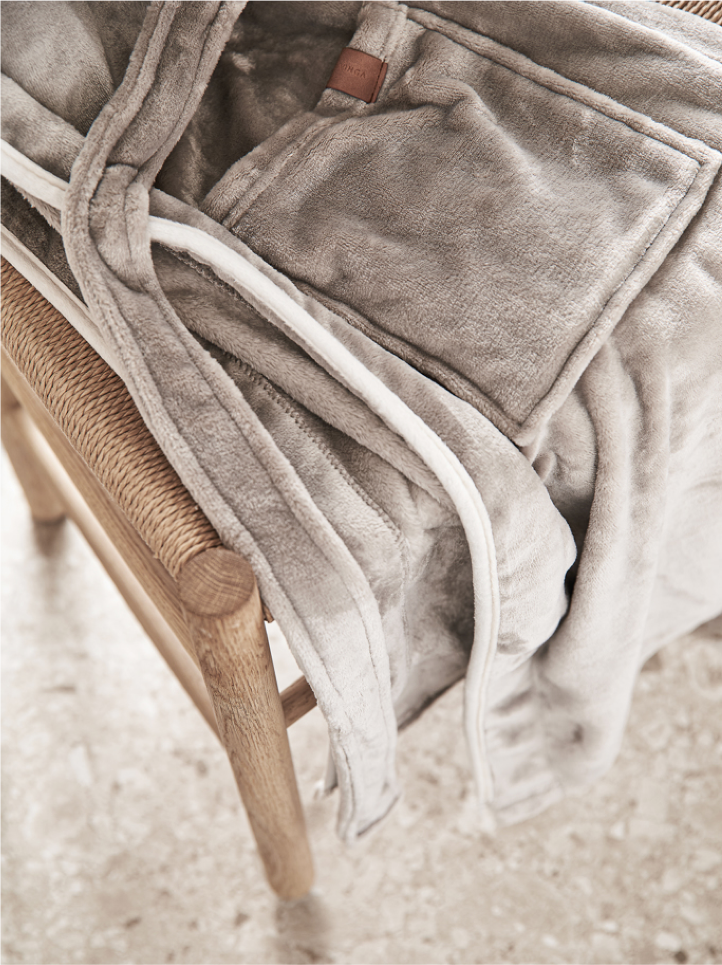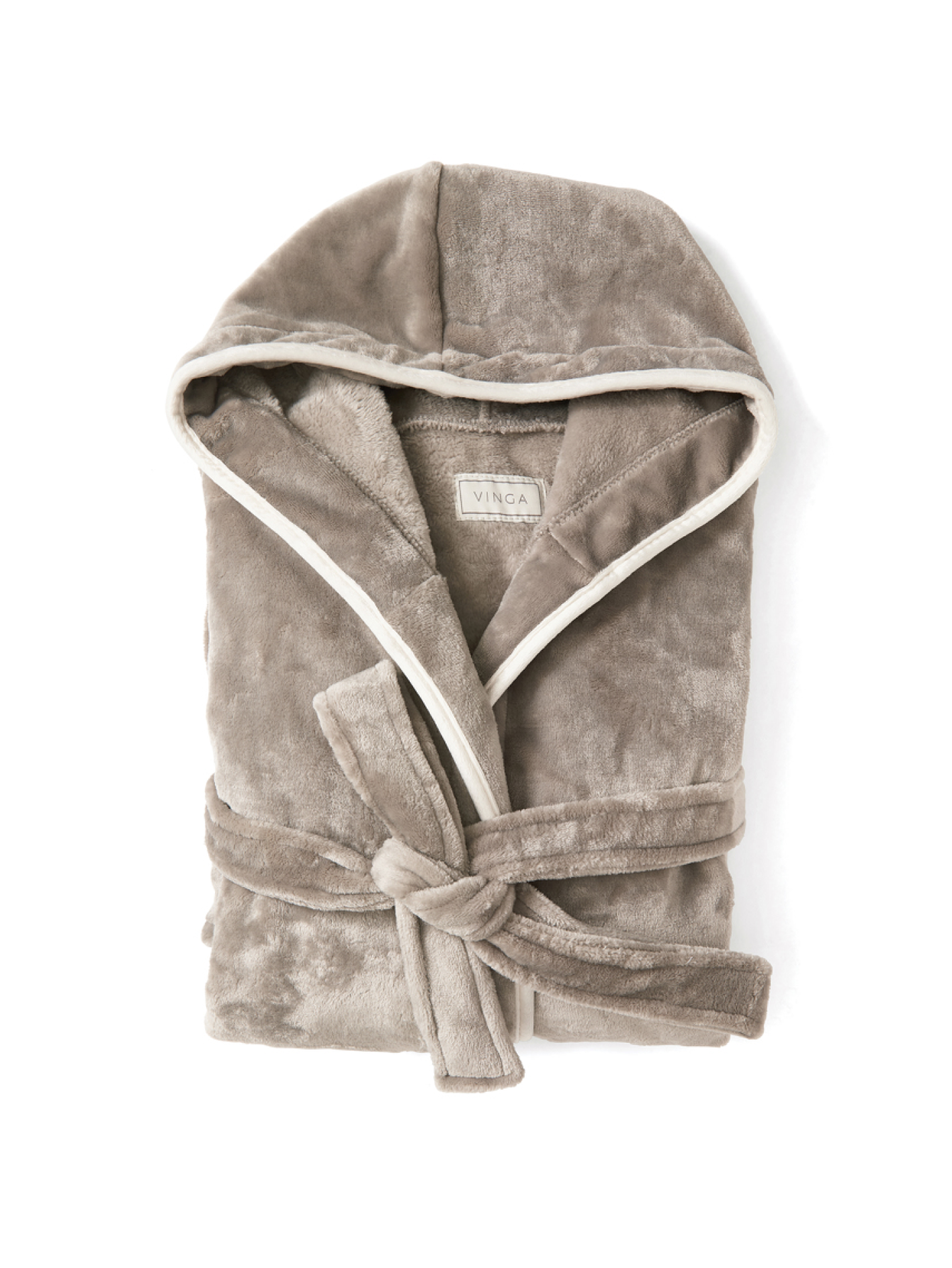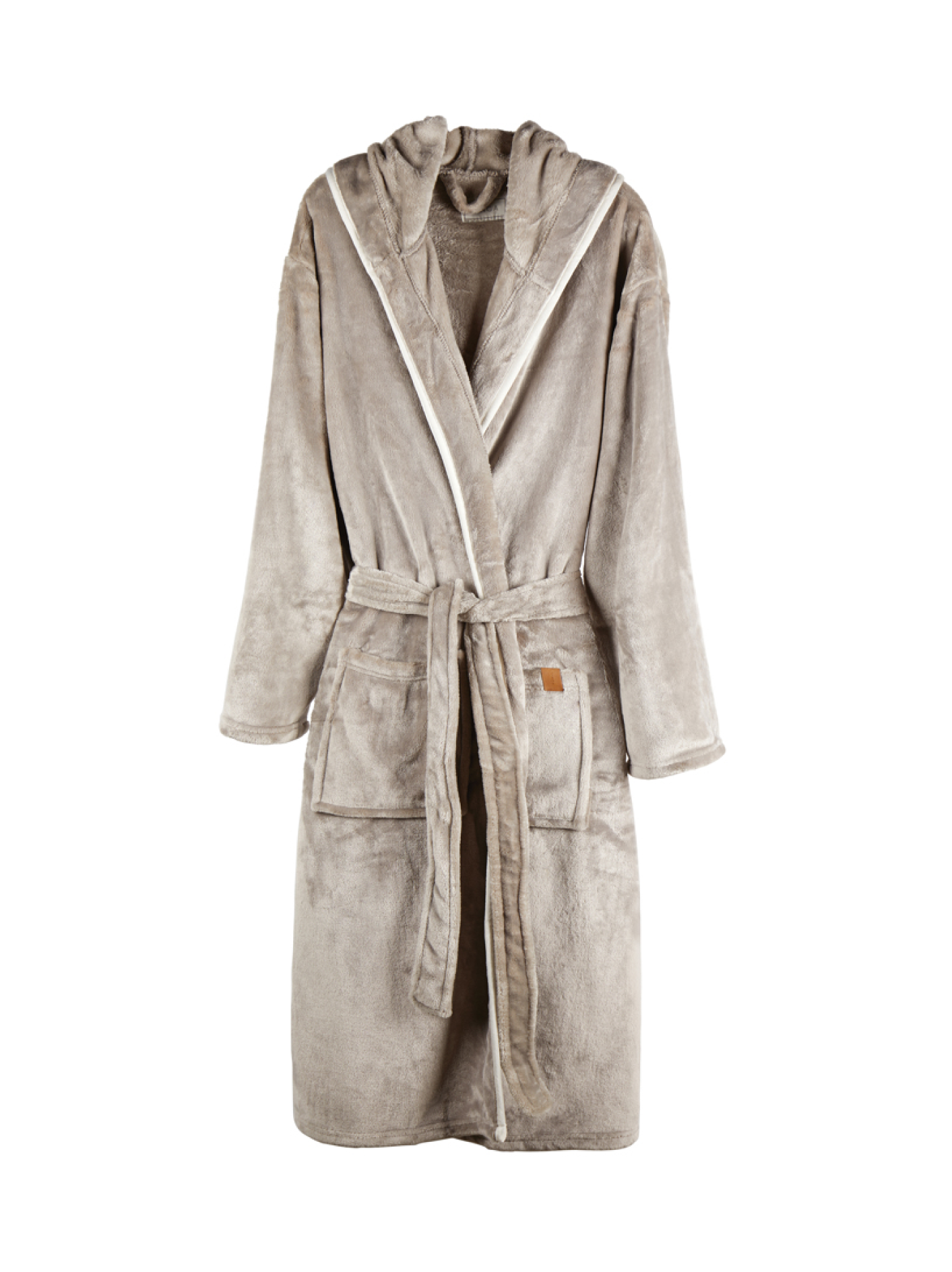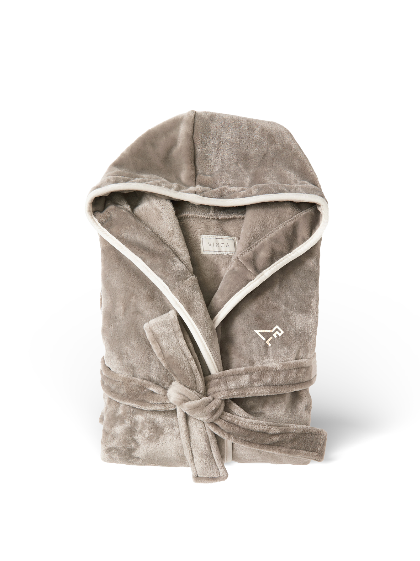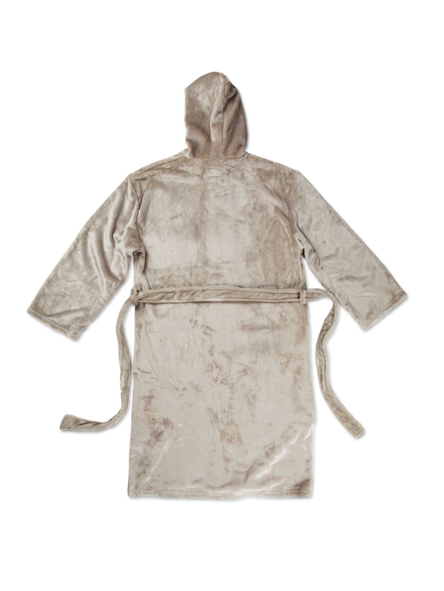 Měkký, pohodlný župan z luxusního plyšového materiálu s velkou kapucí a ozdobným lemováním. Dvě přední kapsy a pásek v pase. Župan je vyroben ze 70 % recyklovaného materiálu z PET lahví a je vakuově balen. Certifikace OEKO-TEX Standard 100. Velikost L/XL.