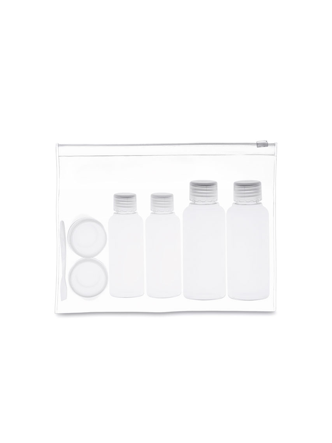 Tato praktická cestovní sada obsahuje 6 prázdných lahviček různých objemů (100 ml, 50 ml a 10 ml), které vám usnadní balení hygienických potřeb na cesty. Taštička je vyrobena z průhledného materiálu, což zajišťuje rychlou orientaci v obsahu a bezproblémové kontroly na letištích.